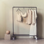 Les roulettes font partie intégrante du design du portant et deux d'entre elles sont équipées d'une fonction de freinage sur laquelle on peut appuyer pour bloquer les roues.