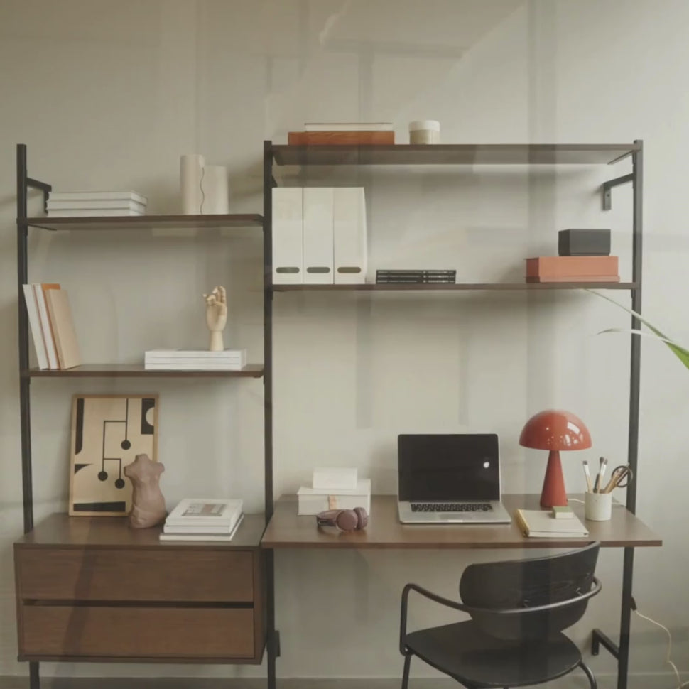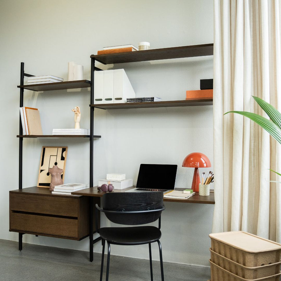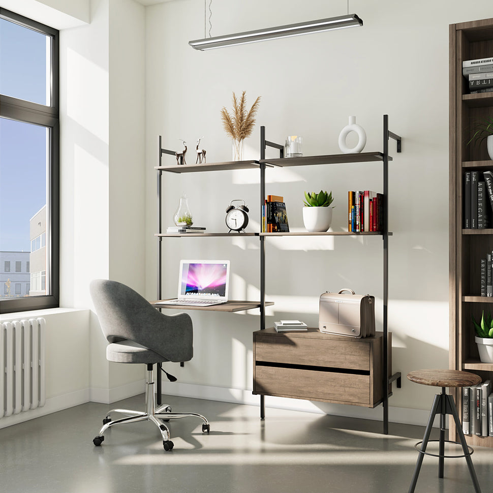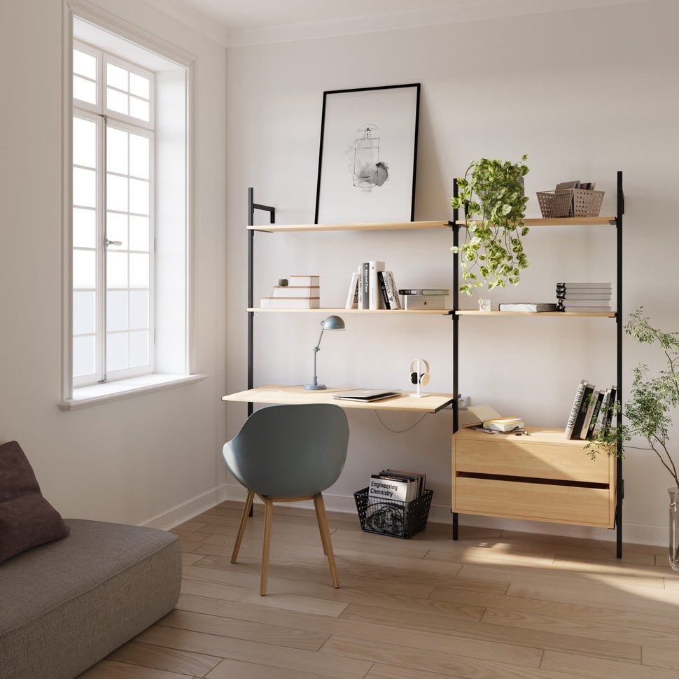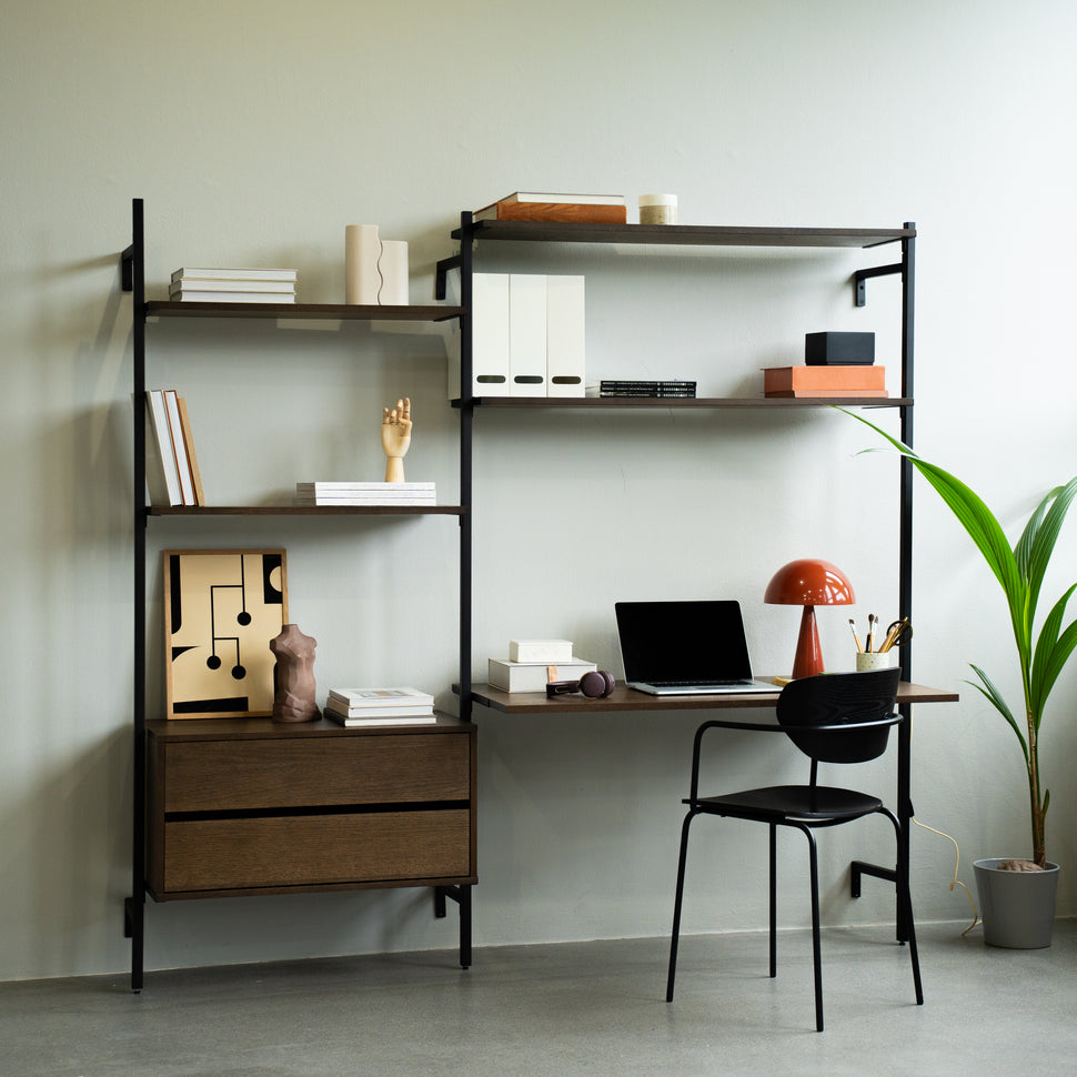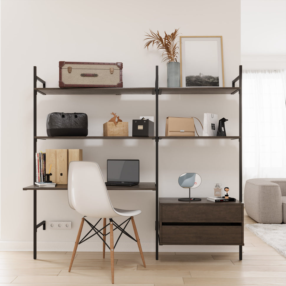 Ce système de rangement avec bureau intégré a tout pour plaire. Il s’agit d’une solution 2-en-1, fonctionnelle et élégante, qui vous offre assez d’espace pour ranger tous vos accessoires de bureau sur les quatre étagères ou dans la commode en bois, équipée de deux tiroirs.
