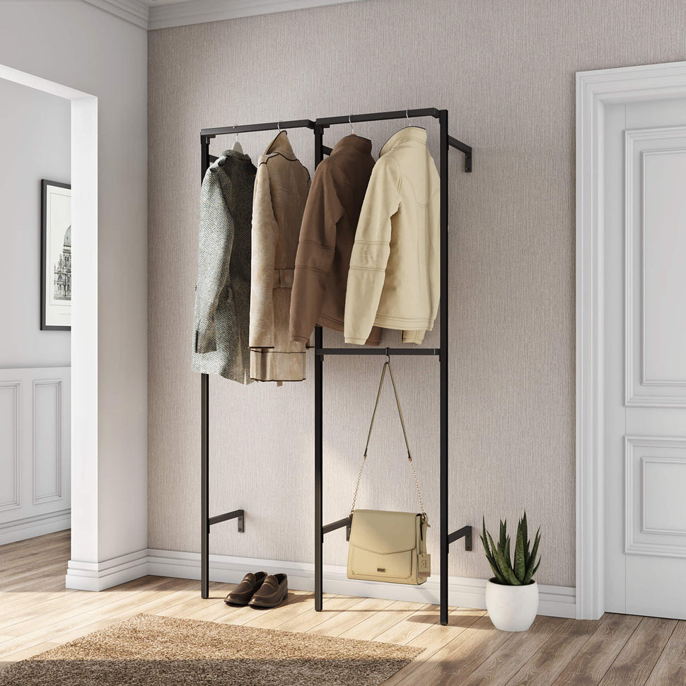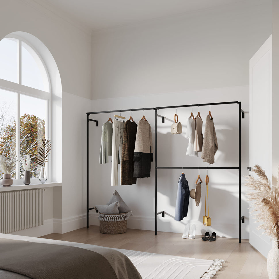 Cette penderie Frame walk-in à deux colonnes vous offre assez d'espace pour ranger tous vos vêtements. La particularité de ce système est qu'il offre de l'espace pour les chemises, vestes et t-shirts, mais aussi un espace pour les vêtements qui prennent plus de place tels que les robes ou les manteaux plus longs.