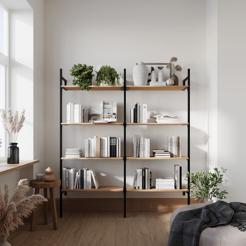 Ne manquez plus jamais d’espace avec ce système d’étagères ! Vous disposez de deux colonnes, chacune est équipée de quatre étagères en chêne qui peuvent être réglées selon vos besoins et vos envies. Ce système est idéal pour ranger vos chaussures, plier vos vêtements ou mettre en valeur vos sacs à main et autres accessoires.