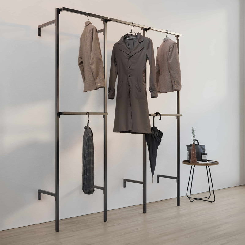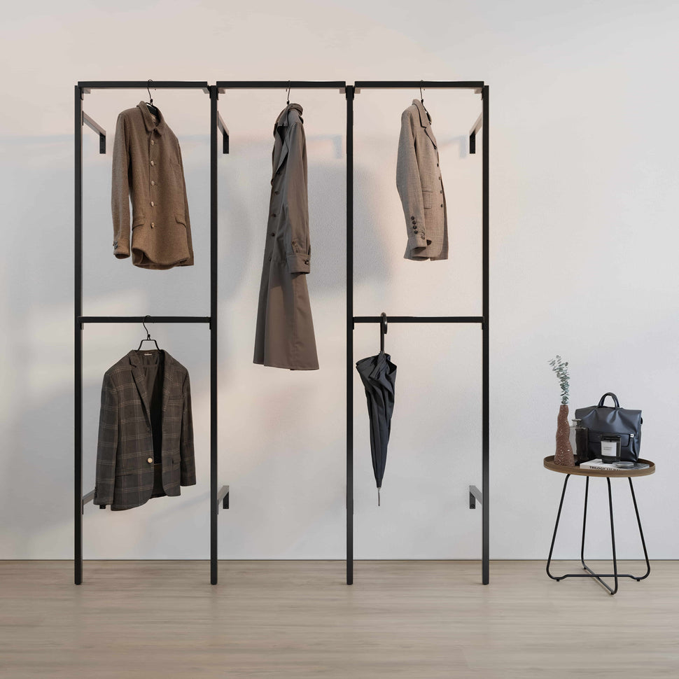 Créez le walk-in closet de vos rêves à l’aide de cette penderie ouverte ultra moderne. Ce dressing est composé de trois colonnes, deux d’entre elles sont équipées d’une double tringle pour suspendre les vêtements courts, celle au centre est idéale pour les vêtements plus longs comme les robes ou les manteaux. Si vous avez assez d’espace, n’hésitez pas à assortir votre penderie avec d’autres solutions de rangement issues de notre Frame collection. Vous pouvez par exemple ajouter des étagères pour les paniers de rangement, les chaussures ou les sacs à main.