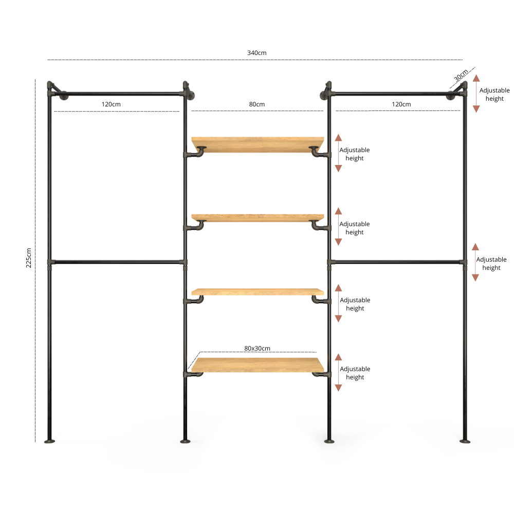 Largeur: La largeur dépend de la variante choisie. Tu peux choisir différentes options ci-dessous. Note que les numéros ci-dessous indiquent les longueurs de tuyau que nous utilisons pour ta tringle, et non les mesures externes. Tu devras donc ajouter environ 20 cm pour obtenir la largeur totale. Par exemple, si tu choisis 80 cm/80 cm/80 cm, la largeur totale du portant sera d’environ 260 cm.