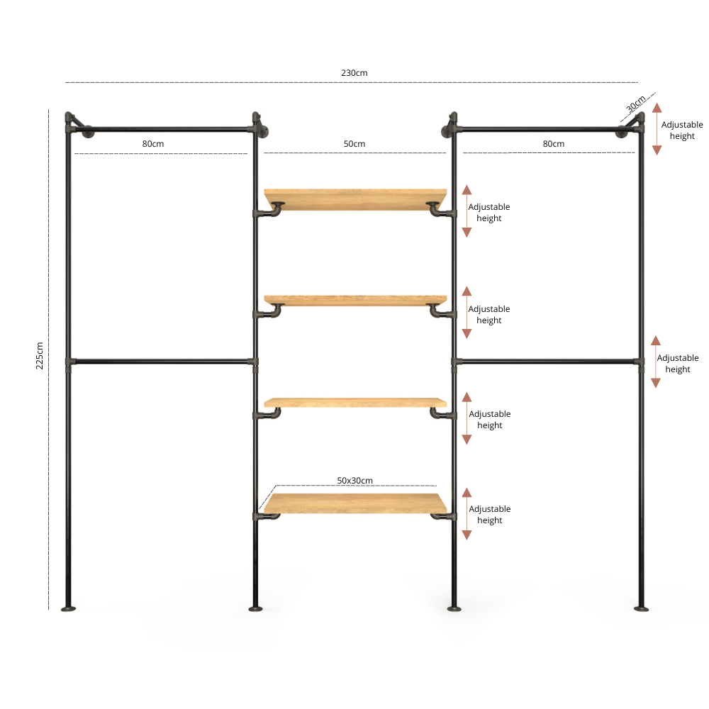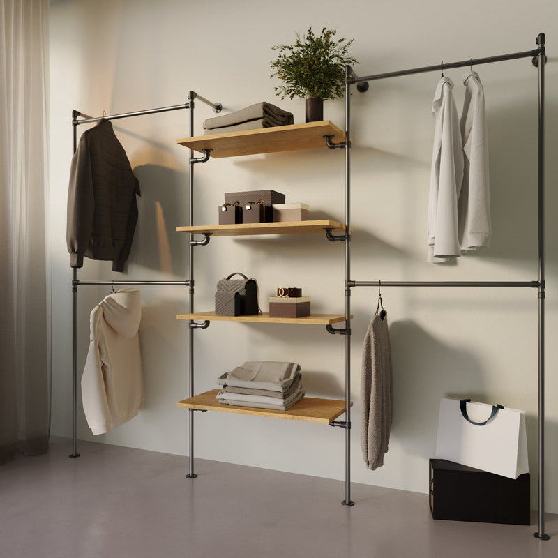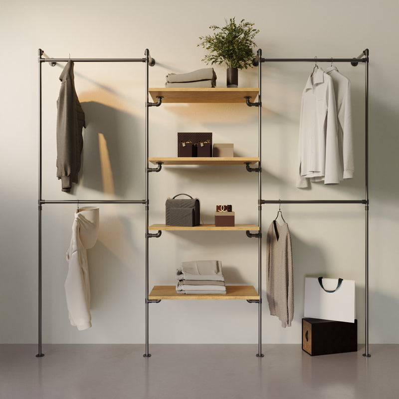 Ce modèle de la collection Walk-in te permet d'accrocher les vêtements sur deux niveaux sur les deux colonnes extérieures et d'utiliser les quatre étagères en bois (réglables en hauteur) situées au milieu pour disposer des chaussures, des sacs, des corbeilles de rangement ou tout autre objet de ton choix. Tu peux utiliser les étagères d'une manière simple et élégante pour mettre en valeur tes chaussures préférées ou pour mettre en valeur des sacs à main, livres, photos ou plantes vertes.