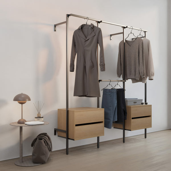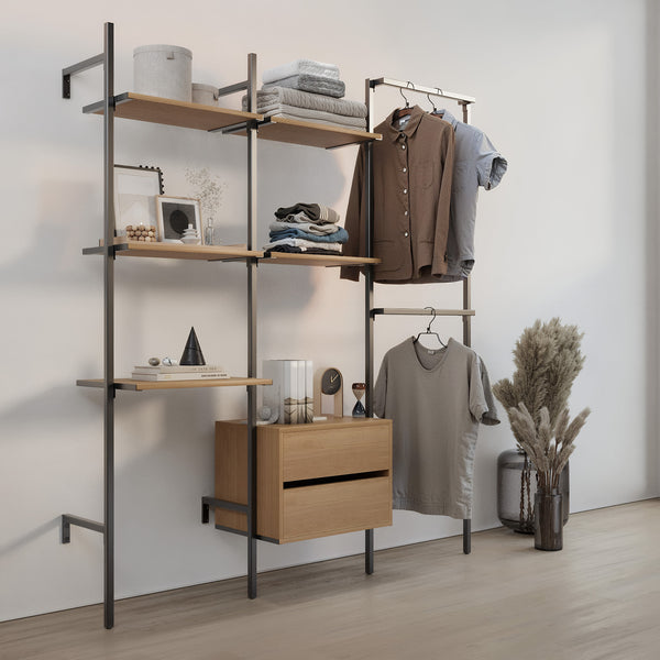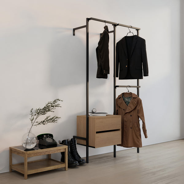 Particulièrement pratique pour les espaces réduits, notre Frame Marlow associe une tringle à vêtements avec une étagère au-dessus. Là encore, vous pouvez choisir entre le chêne fumé ou classique. Ce produit vous permet de ranger toute votre garde-robe et vos accessoires en un seul endroit.