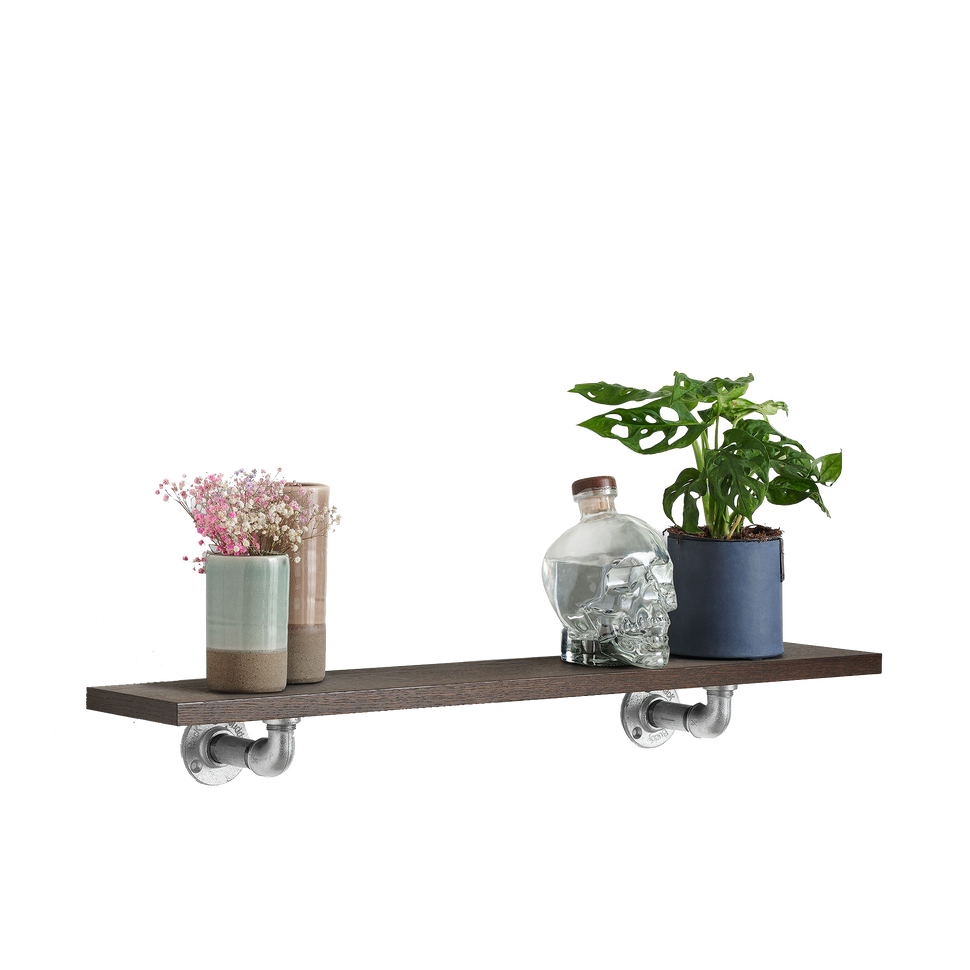 Les étagères avec des longueurs comprises entre 40 et 120 cm sont livrées avec deux supports en tuyaux en fer, alors que celles ayant une longueur supérieure sont livrées avec trois supports.